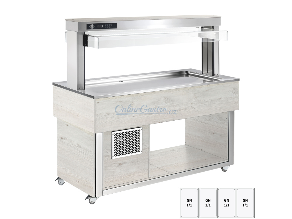 Díky rozměrům 1494 × 650 × 1488 mm (š × h × v) se jedná o kompaktní a přesto dostatečně prostorný bufet, který je snadno přemístitelný díky pojezdovým kolečkům. Jeho elegantní provedení v dekoru Hemlock (bílé dřevo) působí moderně a vkusně v jakémkoliv gastronomickém prostředí. Přídavné funkce jako LED osvětlení, motoricky ovládaná dechová clona z plexiskla a snadno odnímatelný filtr výparníku činí tento bufet nejen estetickým, ale i maximálně praktickým řešením.
