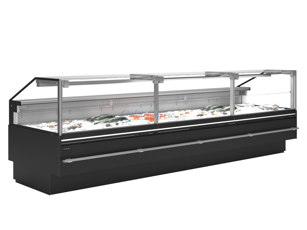 Tento prémiový obslužný pult je vybaven nerezovou vanou o hloubce 50 mm, speciálně navrženou pro bezpečné uchovávání čerstvých ryb na ledu. Elegantní černé provedení doplňuje výklopné čelní sklo s ochranou proti zamlžování, které zaručuje perfektní viditelnost produktů, a teplé LED osvětlení umístěné v horní části vitríny. Pult tak působí stylově a zároveň vytváří ideální podmínky pro zachování kvality a čerstvosti vystavených potravin.