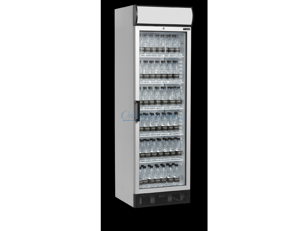 je jednodveřová gastro lednice s prosklenými dveřmi a čistým objemem 347 litrů, ideální pro vystavení nápojů i balených potravin v prodejnách, barech nebo menších gastro provozech. Díky velkému LED reklamnímu panelu umístěnému v horní části navíc nabízí možnost efektivní propagace značky či produktů přímo na místě prodeje. Uvnitř je k dispozici 5 nastavitelných roštových polic s vysokou nosností až 196 kg/m², takže vitrínu lze snadno přizpůsobit různým druhům balení od plechovek po PET lahve. Vnitřní LED osvětlení zajišťuje atraktivní prezentaci obsahu a láká zákazníky k nákupu. Chladicí systém s pomocným ventilátorem udržuje rovnoměrnou teplotu v celém prostoru, což zaručuje ideální podmínky pro skladování a prodej nápojů.