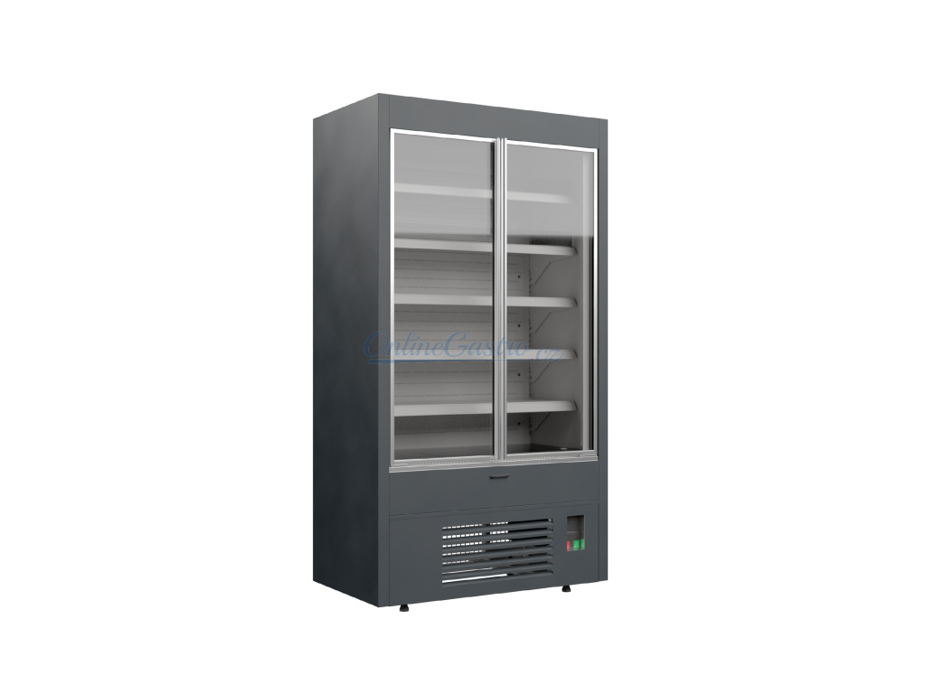 Chladicí vitrína přístěnná Juka Varna 110/60 DUZ mini s vestavěným agregátem s křídlovými prosklenými dveřmi, 5 chlazenými nastavitelnými policemi s cenovkovými lištami a prosklenými izolačními nebo plnými bočnicemi. Vitrína má funkci automatického odtávání a má ventilované chlazení. Zařízení je vybaveno digitálním termostatem a vnitřním LED osvětlením. Dvě horní řady mají plexi zábranu police.