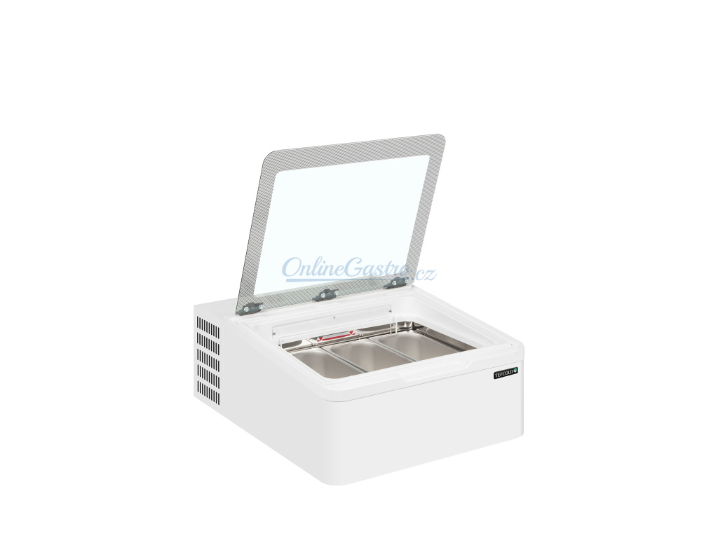 - Kompaktní rozměry – je navržen tak, aby se vešel na pult, pojme tři vaničky a lze jej použít jak v přední, tak v zadní části podniku, což zajišťuje rychlý a efektivní servis oblíbených příchutí zmrzliny.