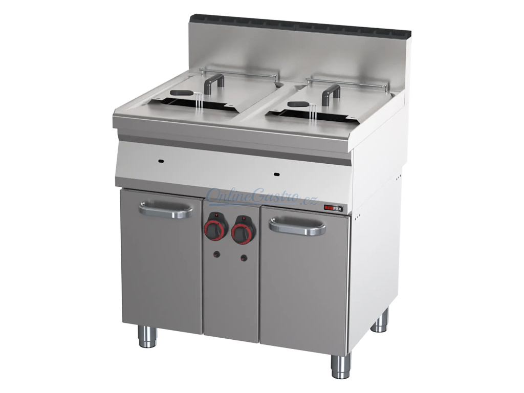 Plynová fritéza FE 70/80G linková se dvěma koši o objemu 2x 15 l, v celonerezovém provedení. Zařízení má pracovní a bezpečnostní termostat s keramickým pláštěm, dlouhé topné těleso (velký povrch) – nižší elektrické zatížení, studenou zónu, kontrolku vyhřátí a síťový vypínač.