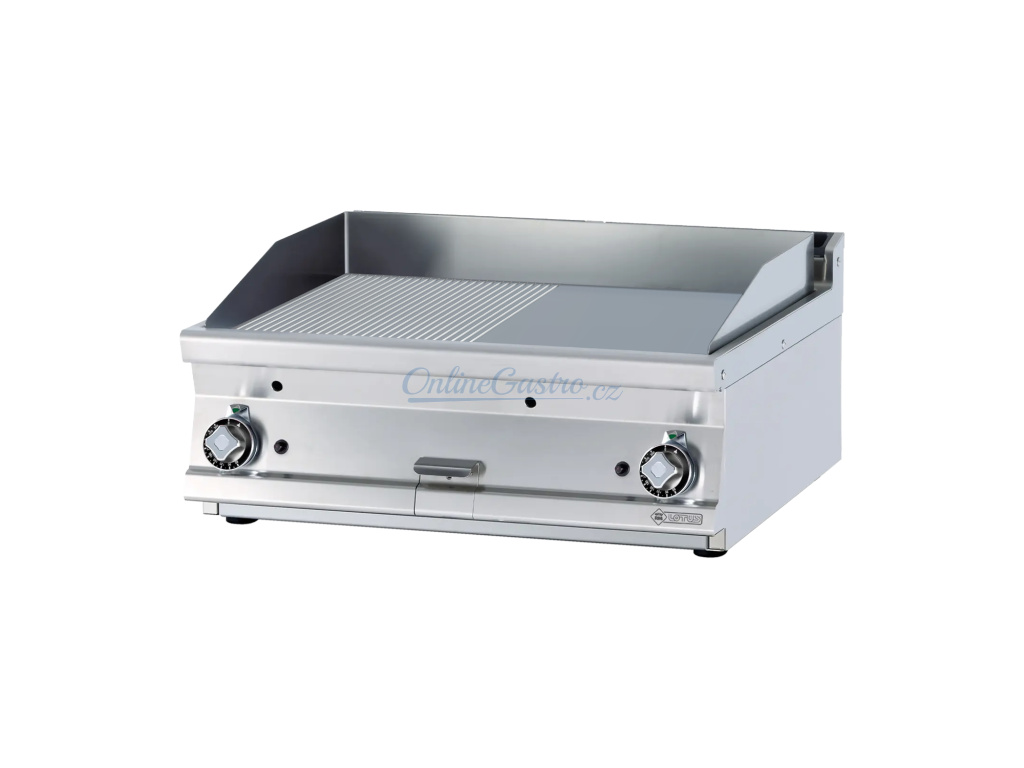 Plynová grilovací deska FTLRT 78 G, kombinovaná. Plotna chromovaná o síle 14 mm zajišťuje vynikající vedení tepla, deska je vybavena kontrolkou chodu, vyhřátí a piezzo zapalováním. Deska obsahuje zásuvku na odpadní tekutiny, 2x samostatné ovládání a 2x vyhřívanou plochu.