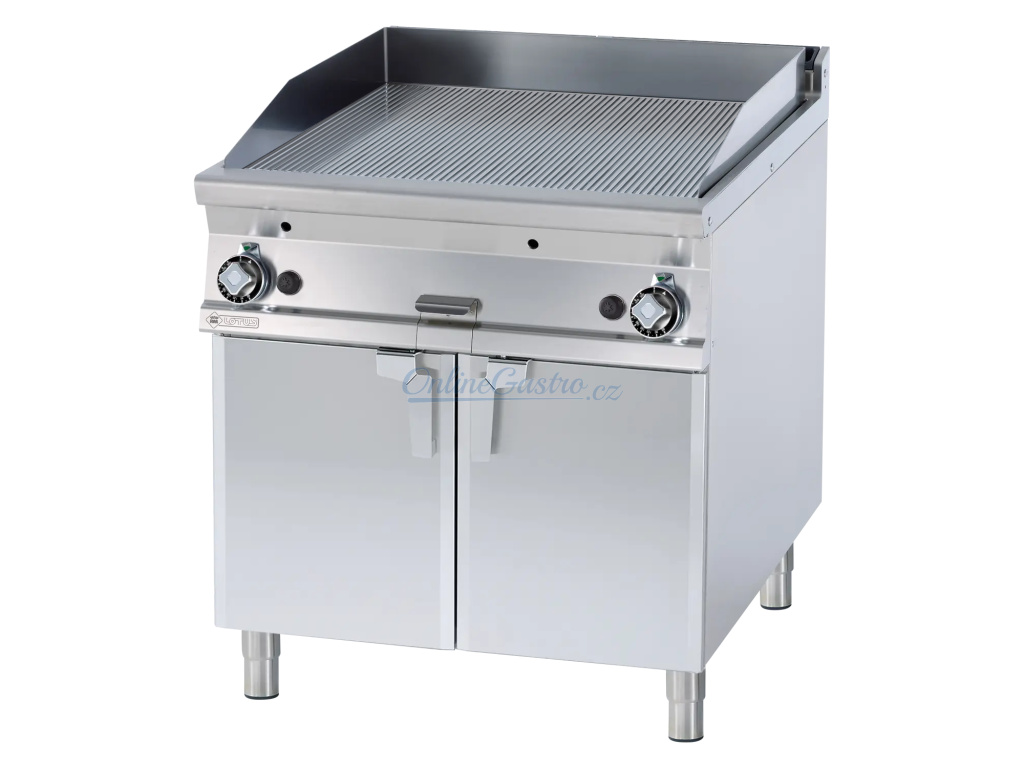 Plynová grilovací deska FTR 98 G, rýhovaná. Plotna zajišťuje vynikající vedení tepla, deska je vybavena kontrolkou chodu, vyhřátí a piezzo zapalováním. Deska obsahuje zásuvku na odpadní tekutiny, 2x samostatné ovládání a 2x vyhřívání plochy.