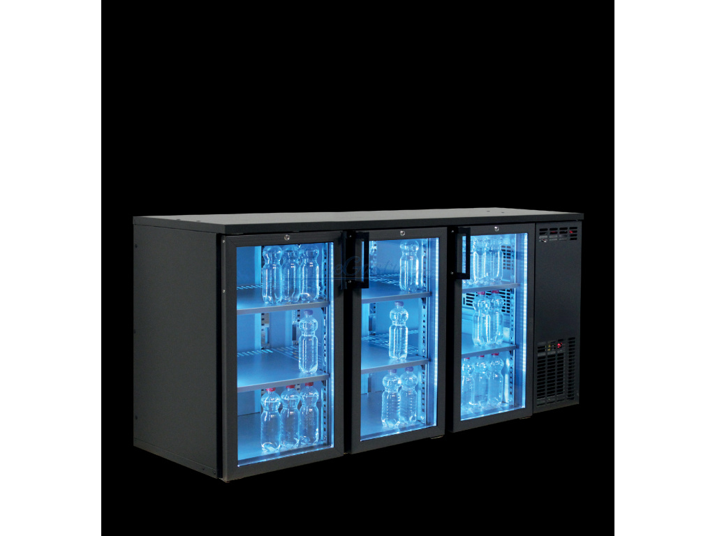 Minibar Serrco by Tefcold SCL 222GMU+ z prémiové řady SERRCO by Tefcold je vysoce kvalitní zařízení, které nabízí čistý objem 422 l, šest nastavitelných polic a teplotní rozsah +2 až +10 °C. Díky ventilovanému chlazení udržuje rovnoměrnou teplotu v celém prostoru a roční spotřeba 605 kWh zajišťuje solidní energetickou účinnost. Troje prosklené křídlové dveře jsou vybaveny barevným LED osvětlením s dálkovým ovládáním, které zvýrazní vystavený sortiment a dodá baru atmosféru. Minibar disponuje zámkem, elektronickým ovládáním a jeho rozměry jsou (š × h × v) 1720 × 560 × 820 mm. Jedná se o minibar s dveřmi, který je díky kvalitnímu zpracování vhodný i do intenzivních provozů.