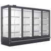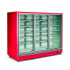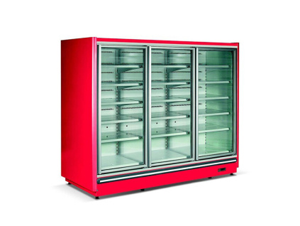 Mrazicí vitrína přístěnná Indus SMI 04 3D bez agregátu se třemi prosklenými křídlovými dveřmi, 3 řadami roštových polic s cenovkovými lištami a prosklenými bočnicemi. Vitrína má funkci automatického odtávání a má ventilované chlazení.