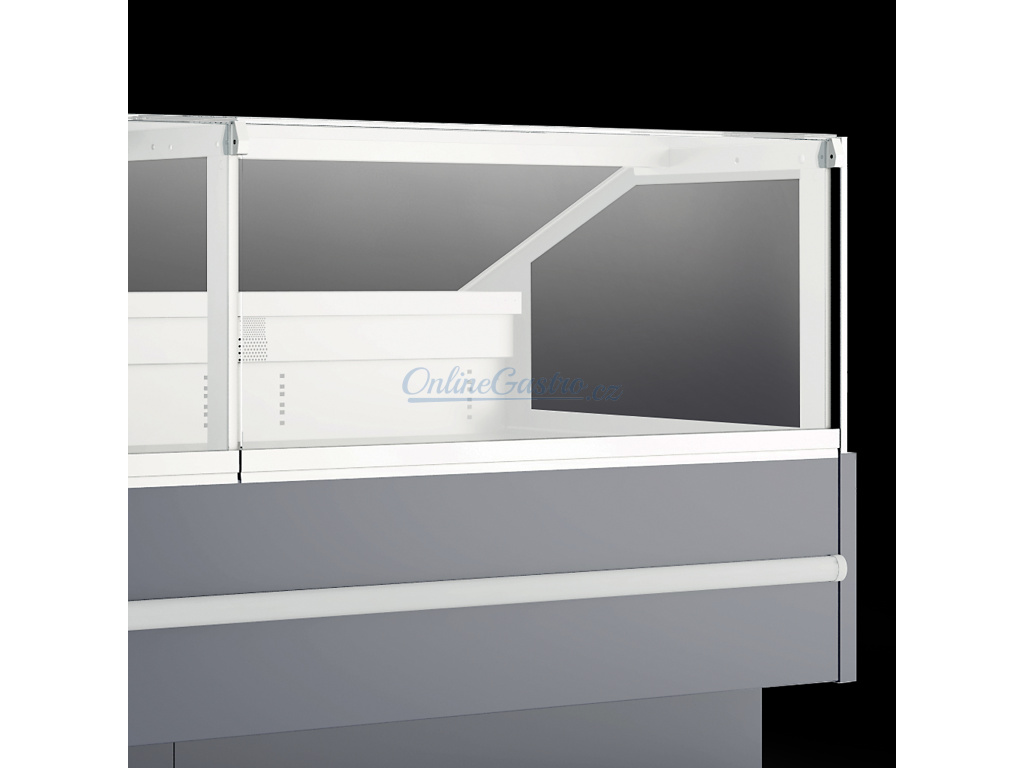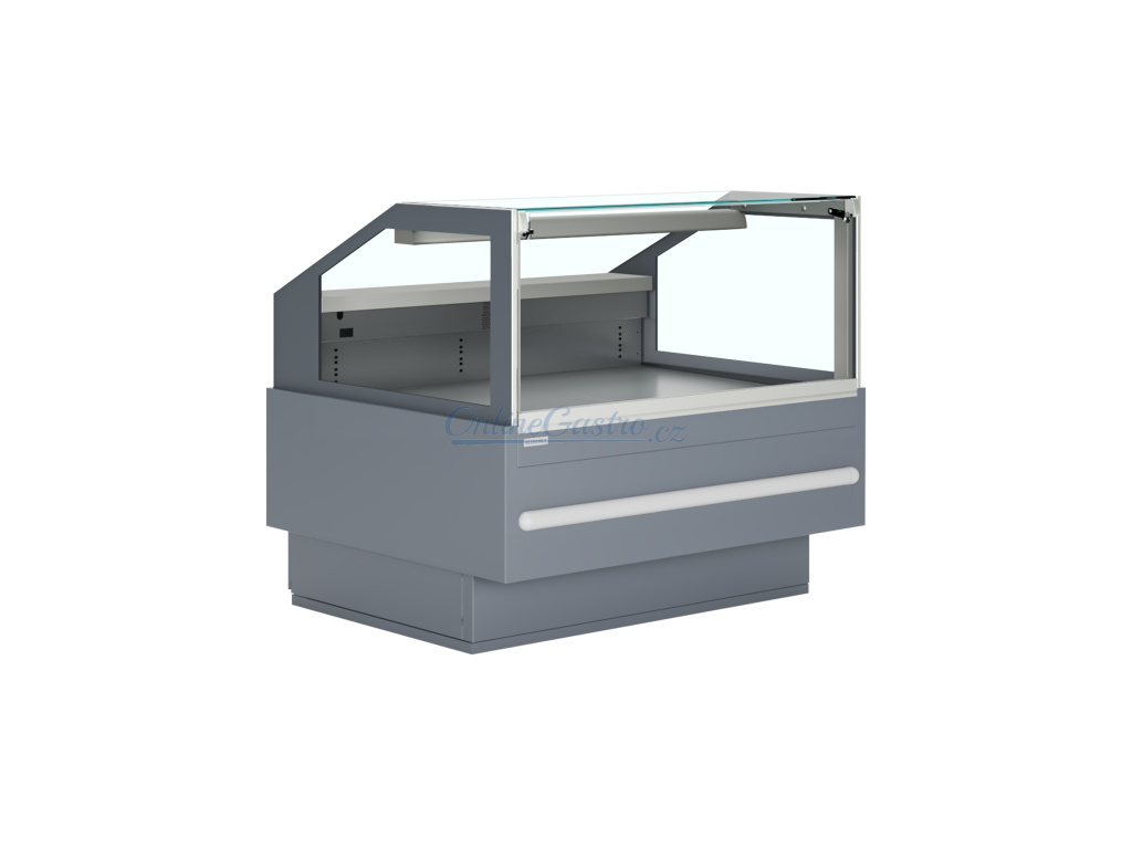 Teplá verze obslužné vitríny s čelním rovným výklopným sklem. Vitrína s extra velkou výstavní plochou.