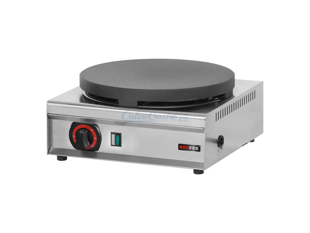 Palačinkovač elektrický o průměru 350 mm, v celonerezovém provedení, plotna ze smaltované litiny. Ve standartní výbavě dřevěná obracečka a roztírač. Je vybaven kontrolkou chodu a nahřátí.