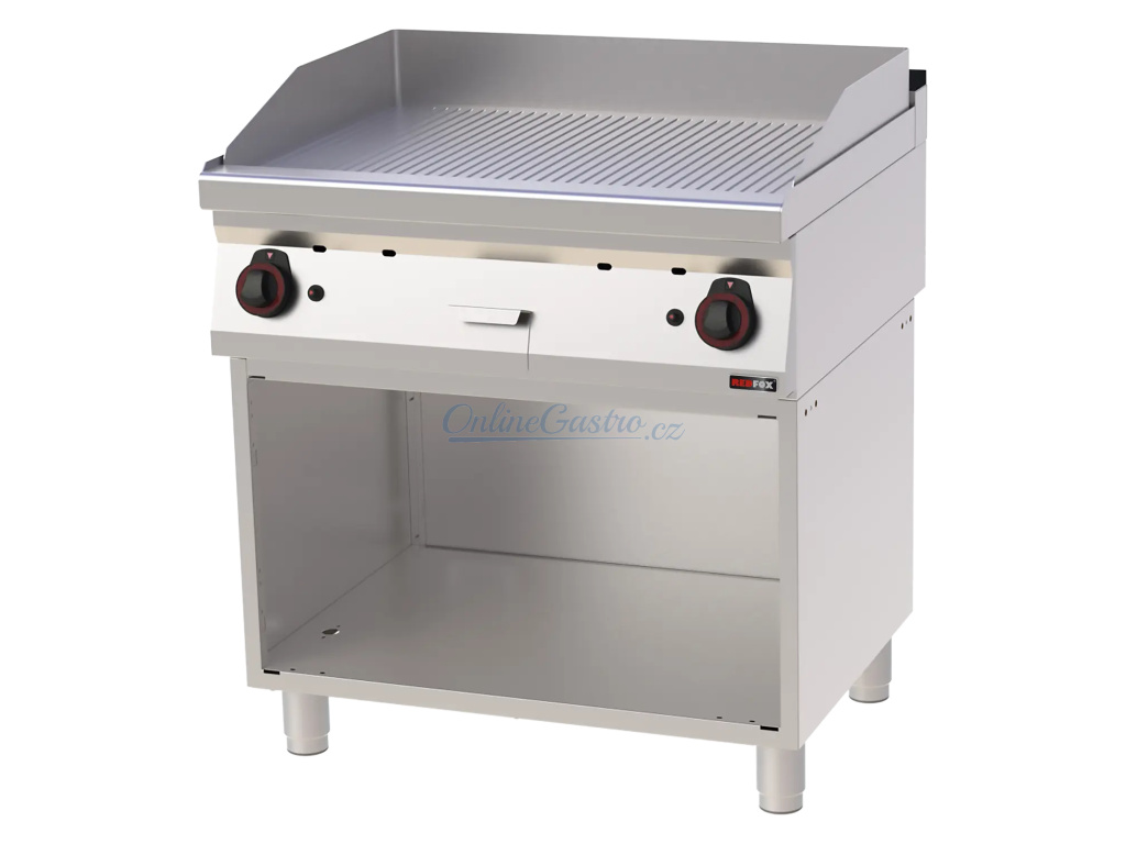 Plynová grilovací deska FTR 70/80 G, rýhovaná. Plotna z pískované oceli o síle 12 mm zajišťuje vynikající vedení tepla, deska je vybavena kontrolkou chodu, vyhřátí a piezzo zapalováním. Deska obsahuje zásuvku na odpadní tekutiny a 2x samostatné ovládání.