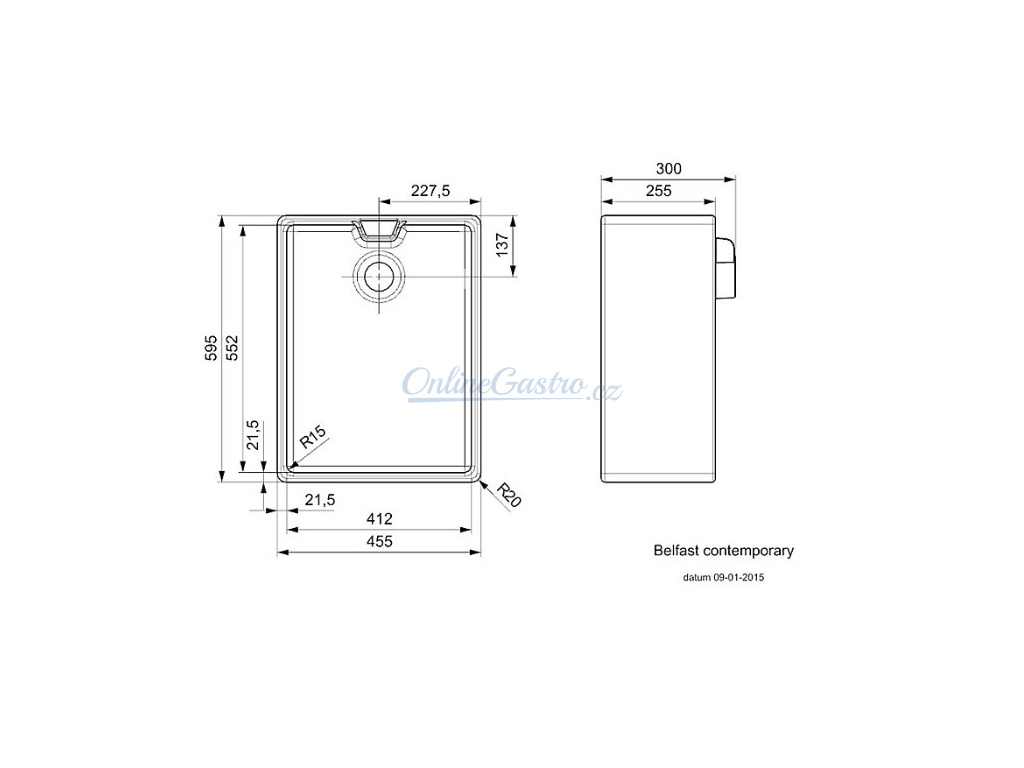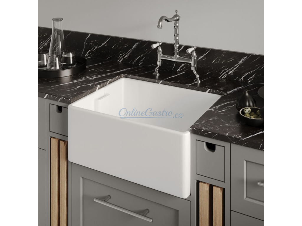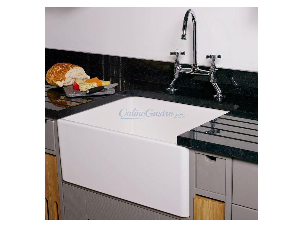 Keramický modulový jednodřez REGINOX BELFAST 595 bez odkapu. Obdélníkový modulový keramický jedno-dřez, věrná replika viktoriánského dřezu. Dřez má hlubokou vaničku, ideální pro omývání velkých předmětů, disponuje masivními stěnami a je dodávaný v kompletu s chromovým odpadem a klasicky integrovaným přepadem v dobovém stylu.