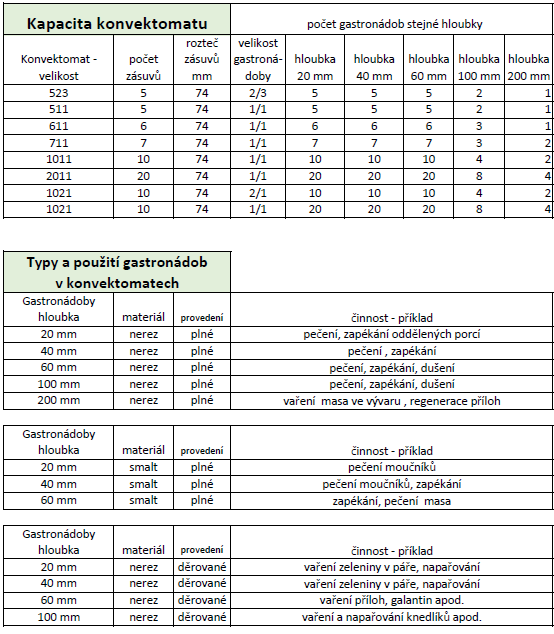 Sada gastronádob je doporučené minimální množství gastronádob pro komfortní vaření v konvektomatu. Jednak je v sadě a níže v tabulce určen počet gastronádob stejné hloubky, který se vejde do konvektomatu daného velikostního typu, ve druhé tabulce jsou doporučené velikosti a hloubky pro různé činnosti a ve třetí je stanoven přibližný počet porcí získaný v jedné vsádce z té které velikosti konvektomatu při přípravě různých typů jídel. Pro přesnější doporučení počtu a velikosti gastronádob je potřeba znát charakter provozu a připravovaných jídel.