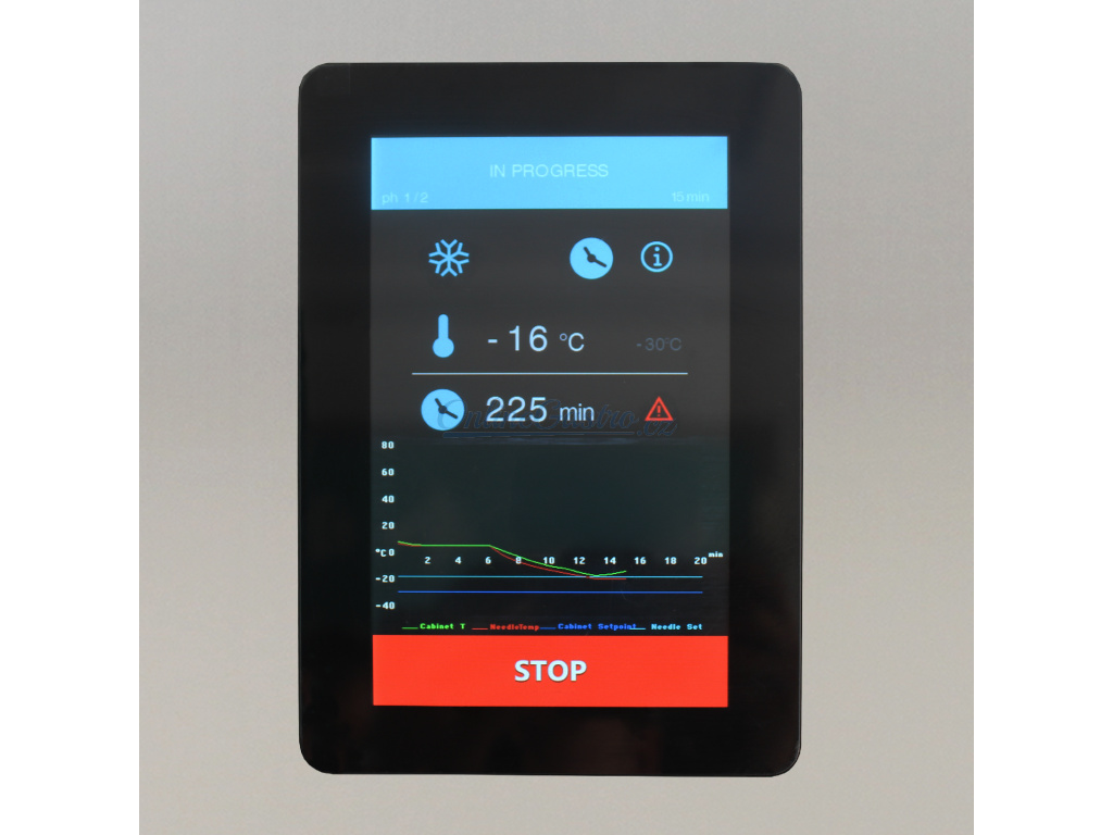 Zařízení má objem 192 l a jeho rozměry jsou 804 × 815 × 1885 mm, takže se bez problému začlení do většiny kuchyňských provozů. Vnitřní prostor o rozměrech 660 × 640 × 870 mm je vyroben z nerezové oceli SS304, která je odolná, snadno se čistí a vyhovuje nejvyšším hygienickým požadavkům. Ovládání probíhá přes moderní dotykový displej s programovatelným termostatem, kde lze volit z přednastavených programů (např. pro ryby, dezerty či zmrzlinu), nebo si nastavit vlastní cykly. Samozřejmostí je export dat v souladu s HACCP, připojení přes USB, vpichová sonda ve standardní výbavě a praktické prvky, jako jsou nastavitelné nožky a reverzibilní samozavírací dveře.
