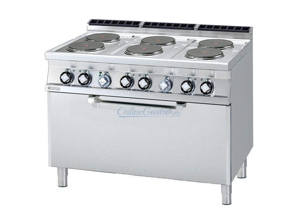 Sporák elektrický třífázový RM CF6 712 ET s troubou statickou pro 3x GN 1/1. Sporák má 6x plotýnku kulatou - průměr 220 mm, příkon 2,6 kW