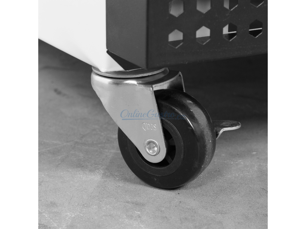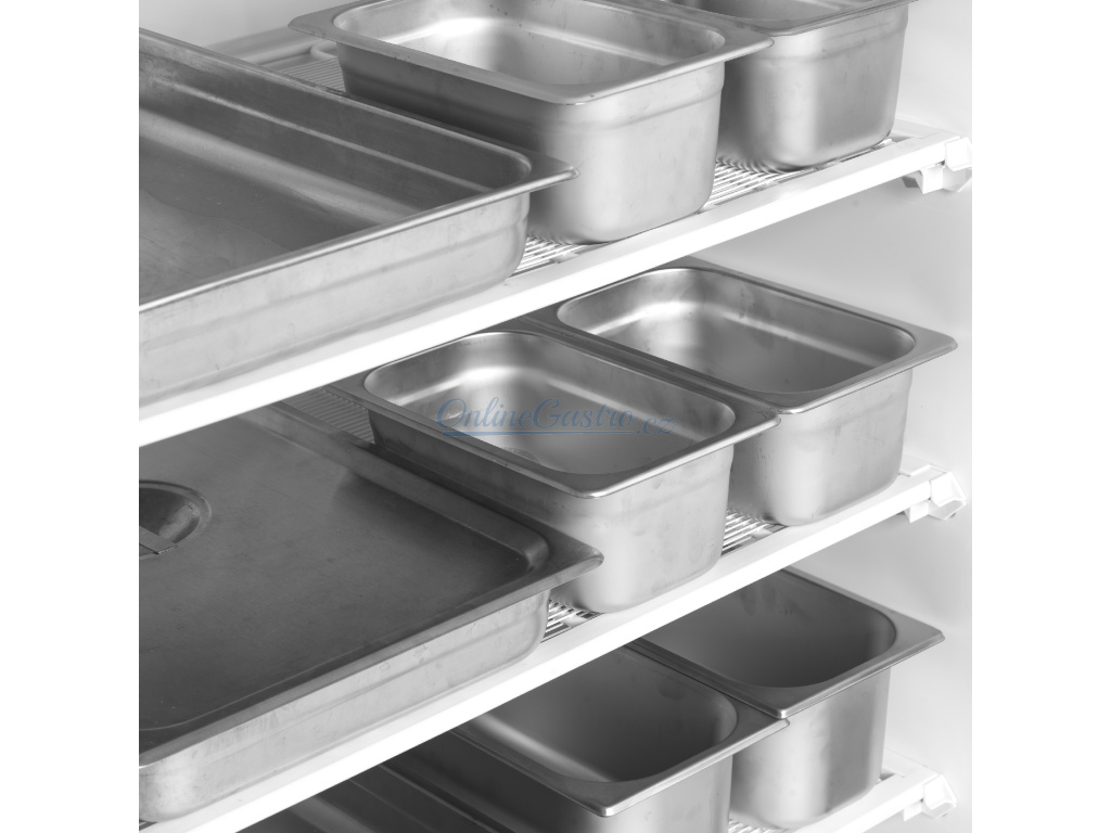 Skříň je vybavena 6 pevnými policemi GN 2/1, které díky svým rozměrům umožňují vkládat i standardní gastro přepravky 600×400 mm. To je velká výhoda v každodenním provozu restaurací a jídelen, kde se často manipuluje právě s těmito přepravkami. Každá police má nosnost až 110 kg/m², což znamená, že skříň zvládne i velmi těžké náklady.