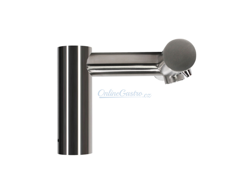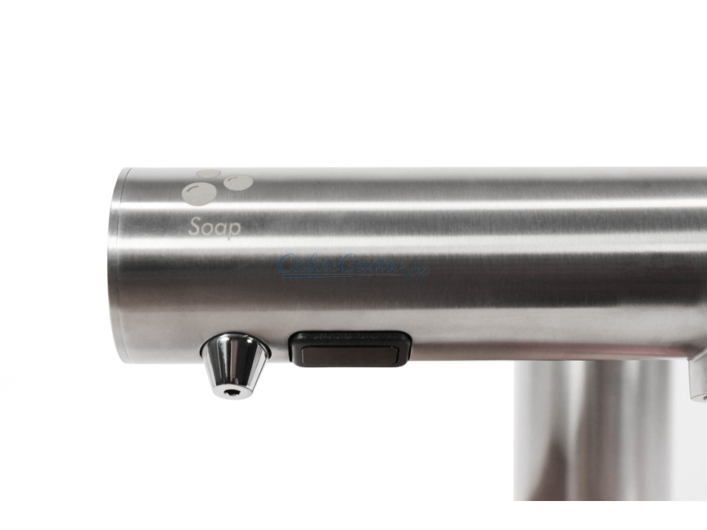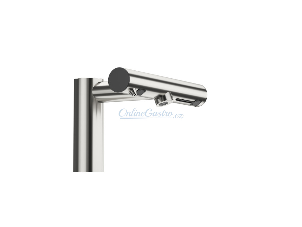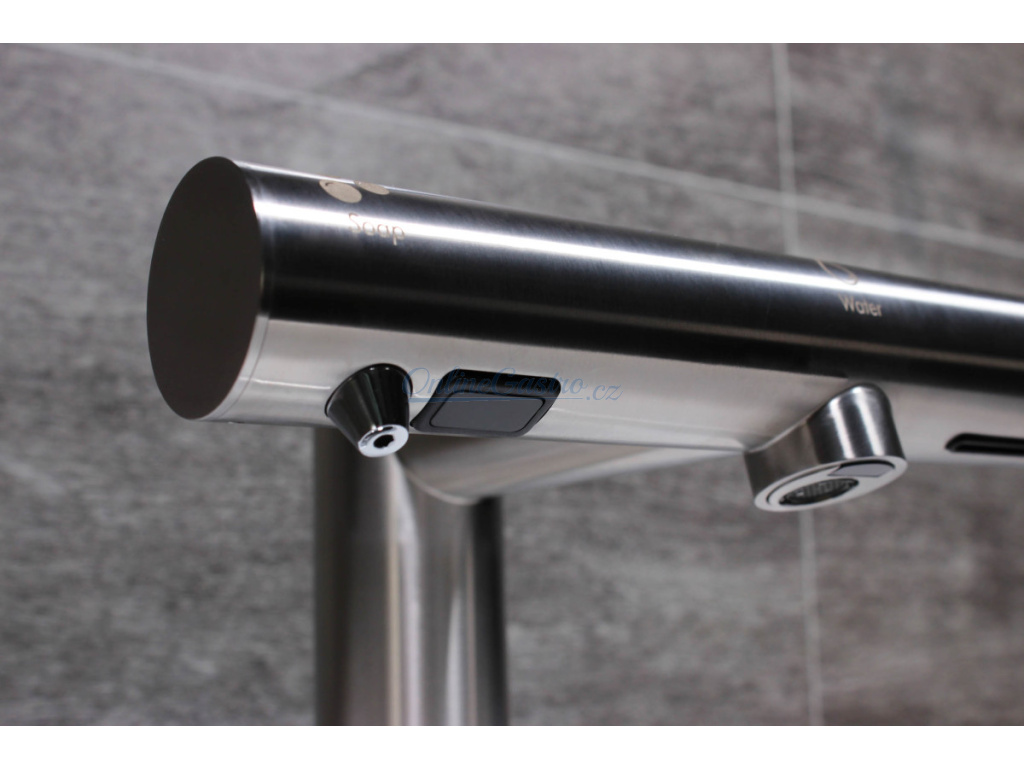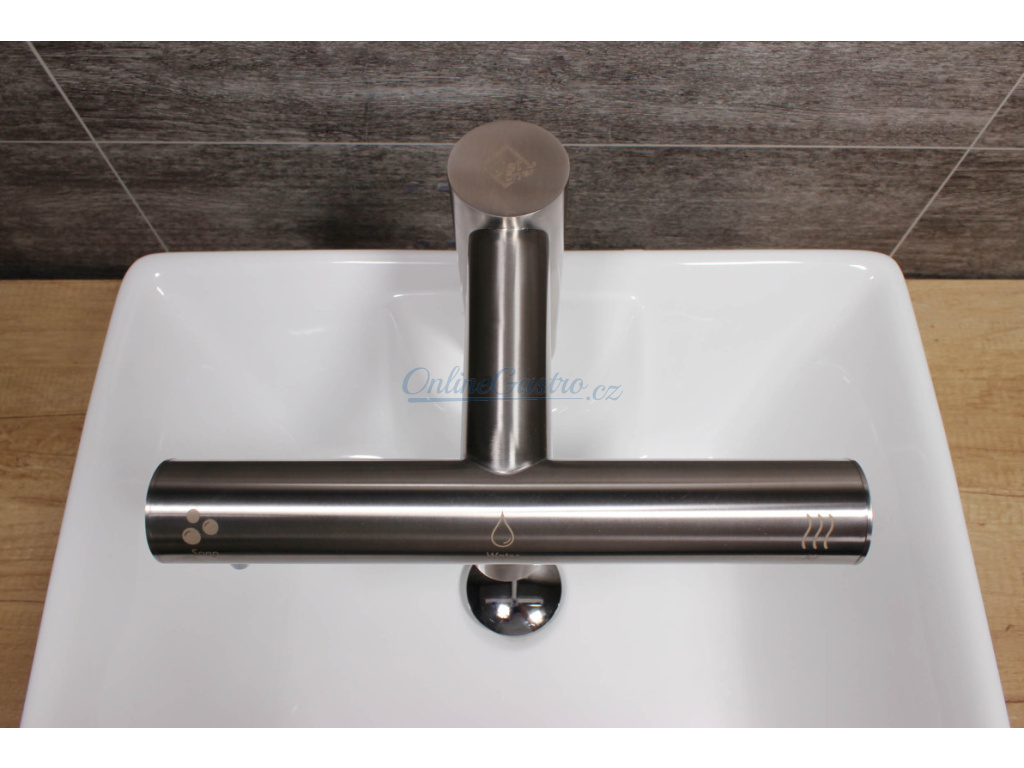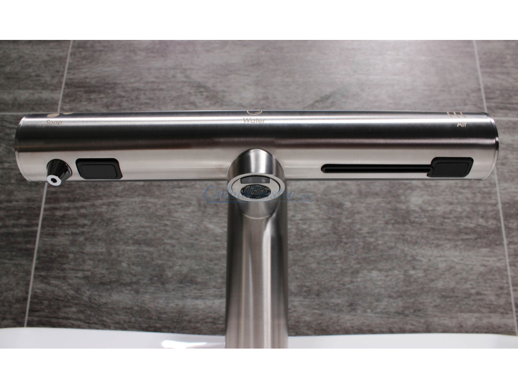 - Provedení: nerezová ocel s kartáčovaným povrchem, kulatá základna, hlavní rameno se třemi výstupy (mýdlo – voda – sušení)