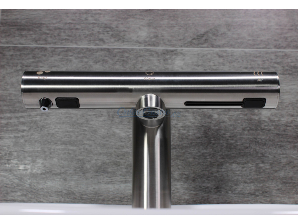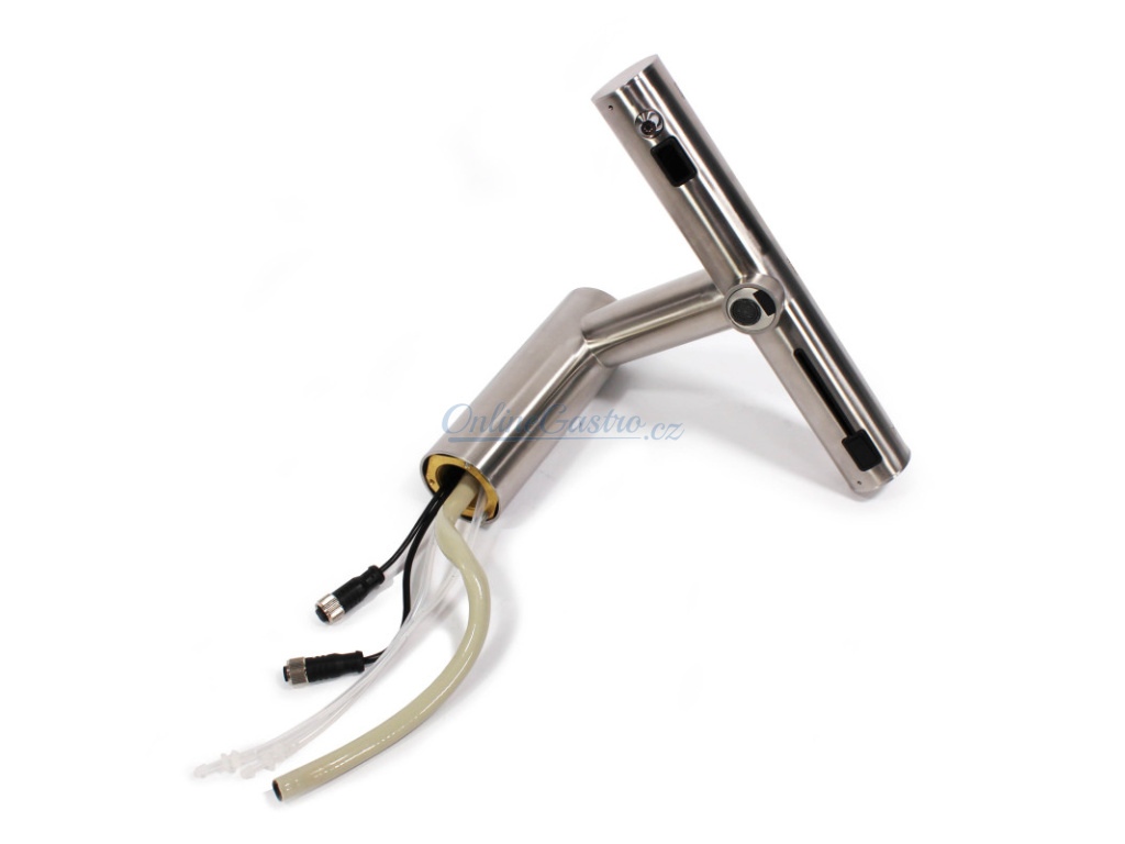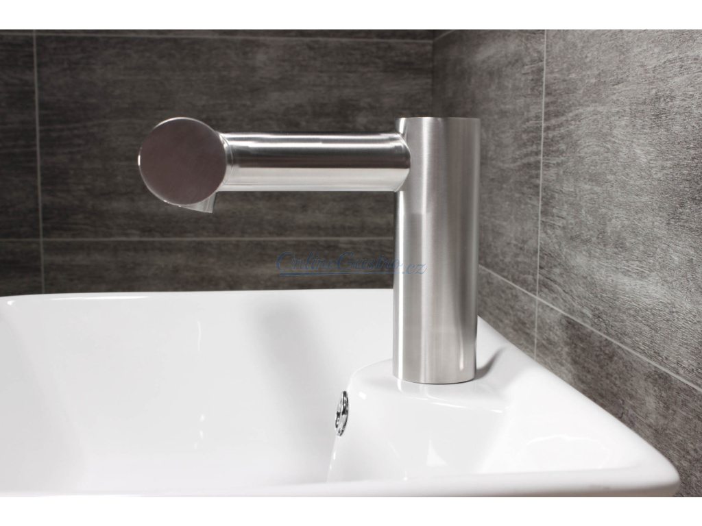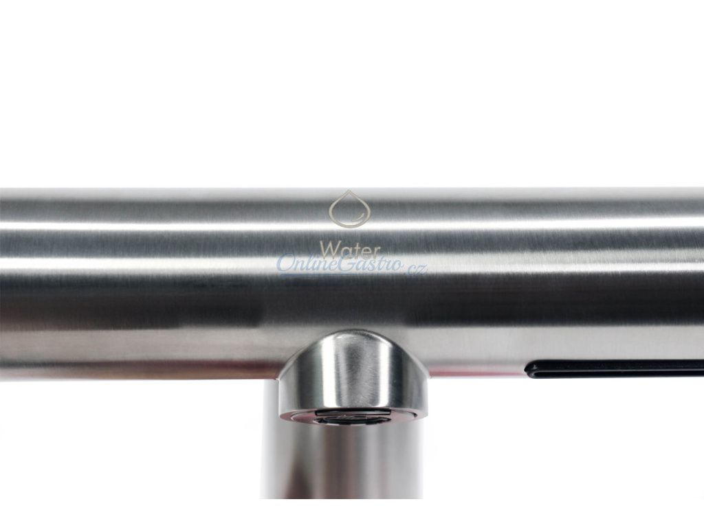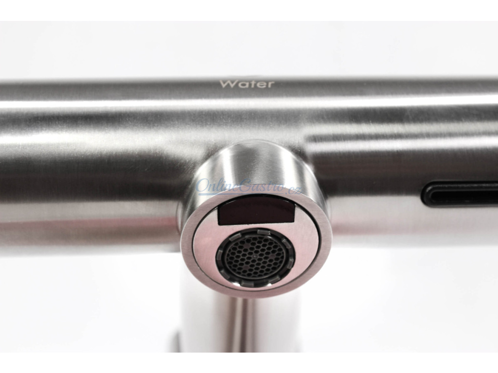 - Provedení: nerezová ocel s kartáčovaným povrchem, kulatá základna, hlavní rameno se třemi výstupy (mýdlo – voda – sušení)