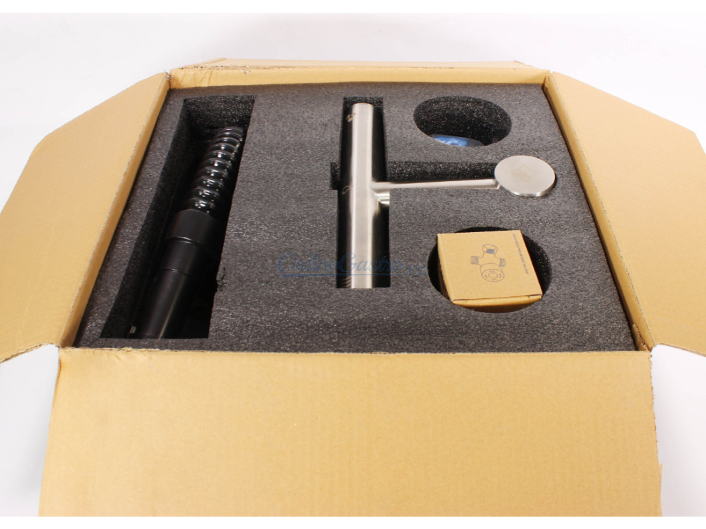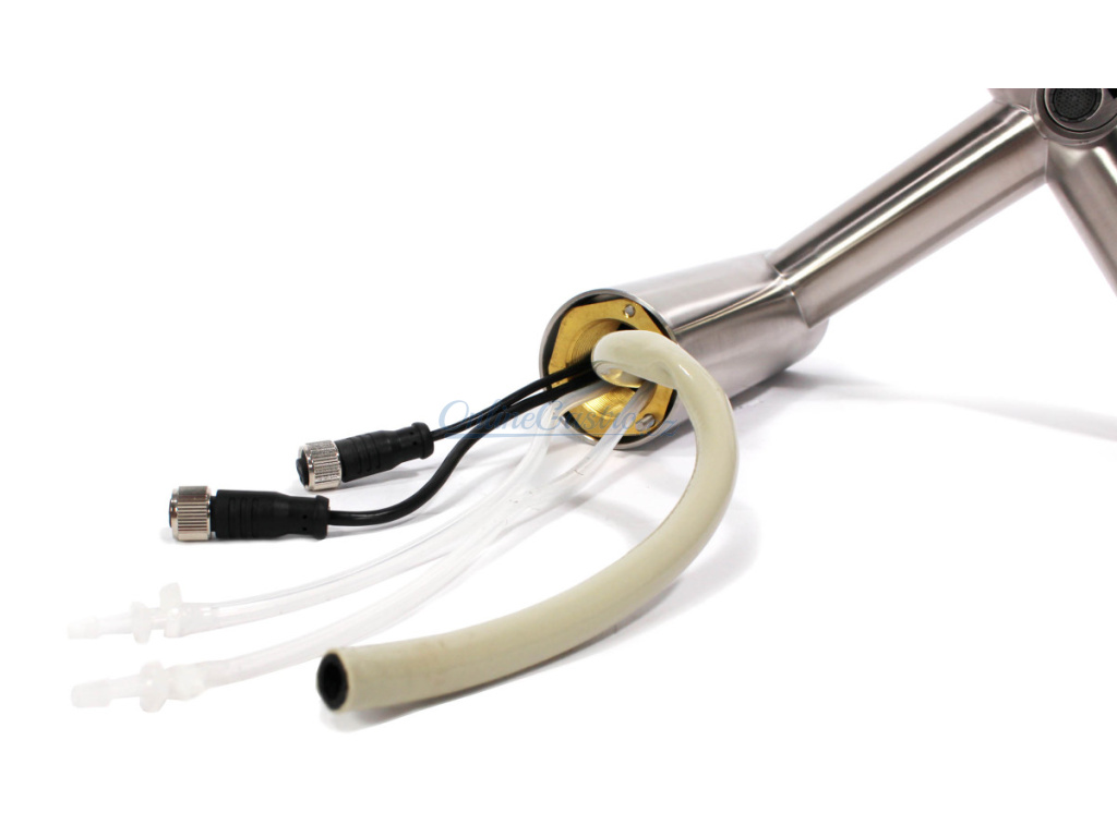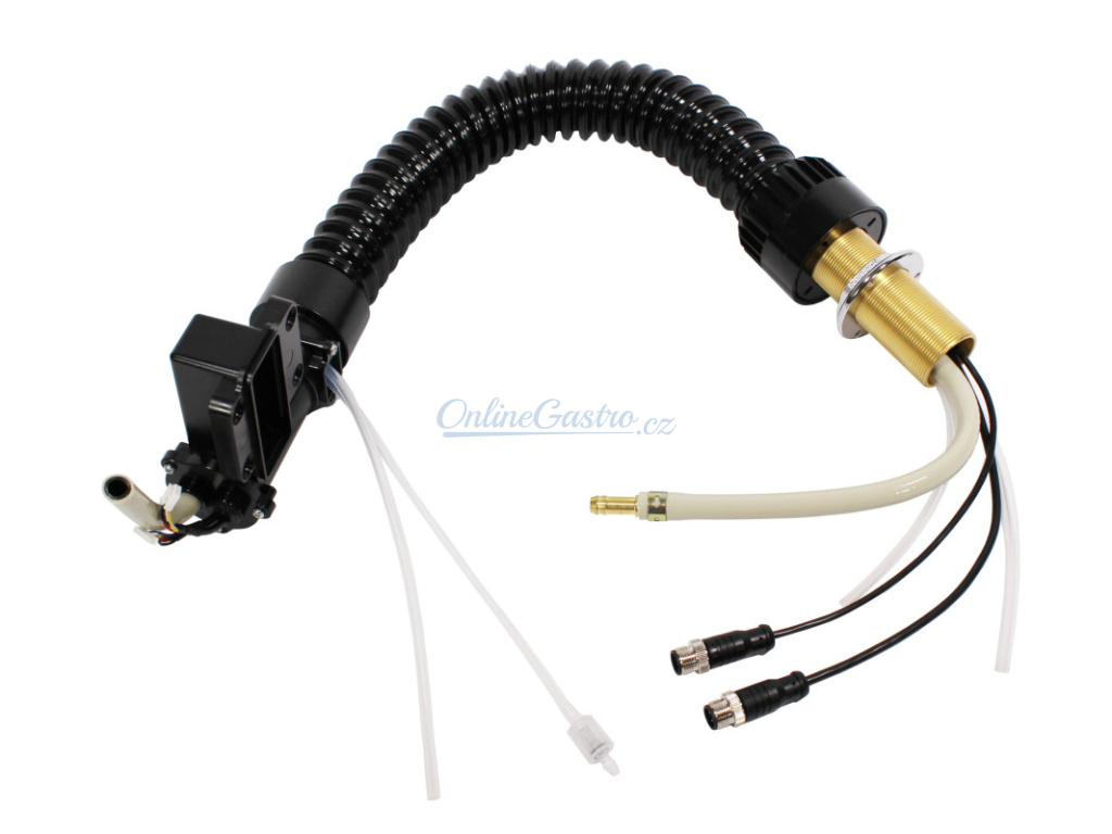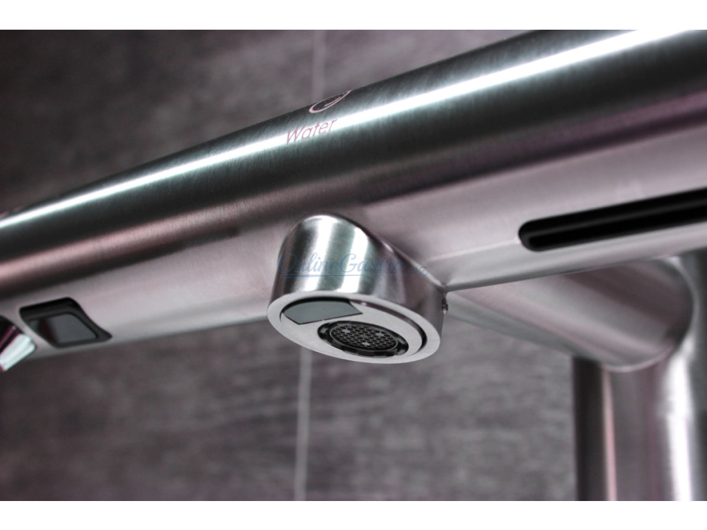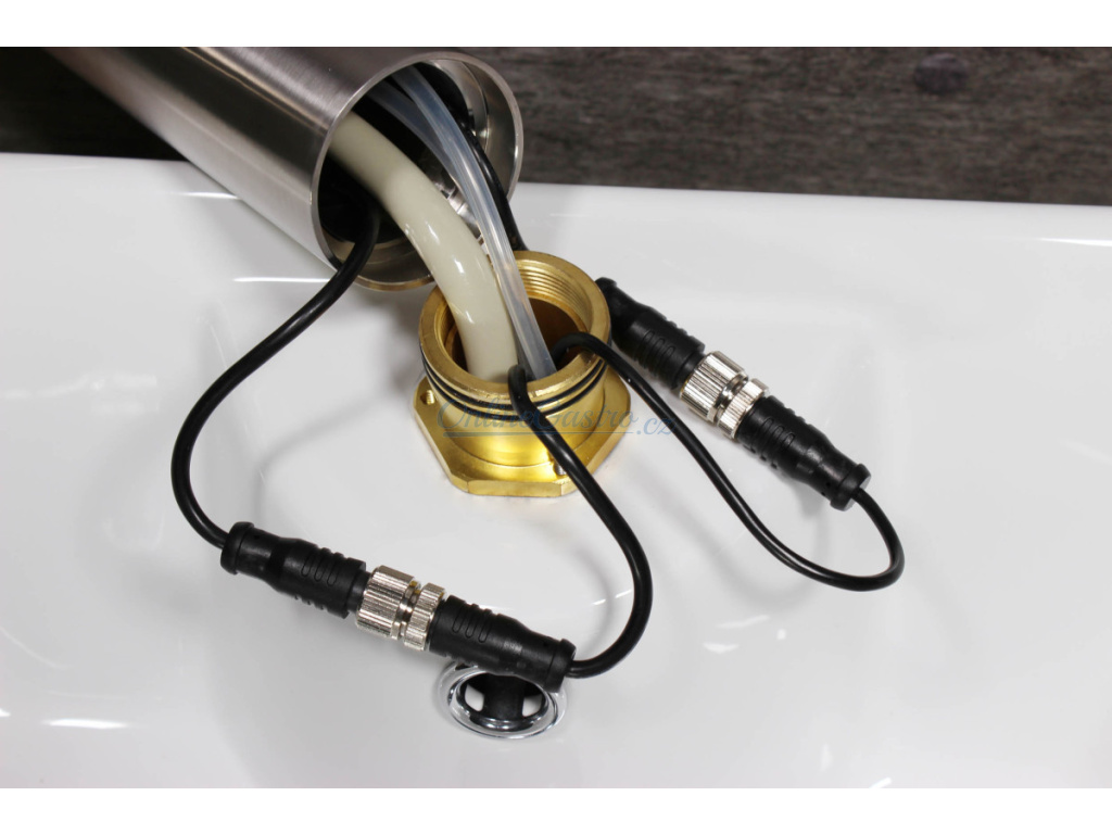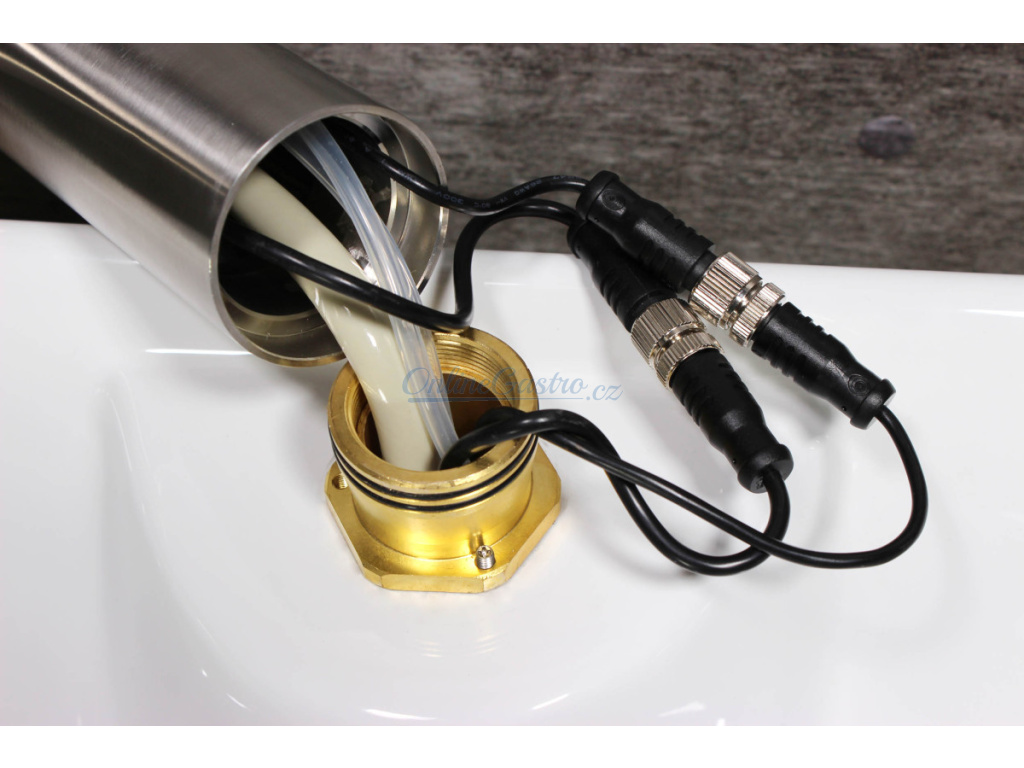 - Provedení: nerezová ocel s kartáčovaným povrchem, kulatá základna, hlavní rameno se třemi výstupy (mýdlo – voda – sušení)