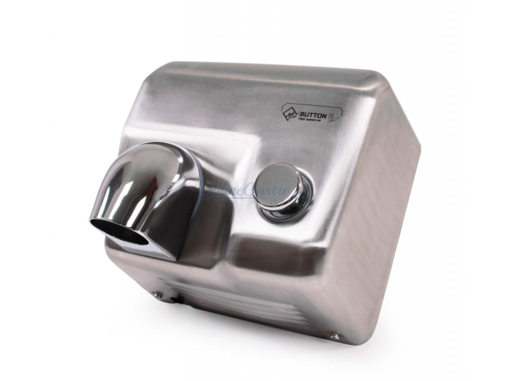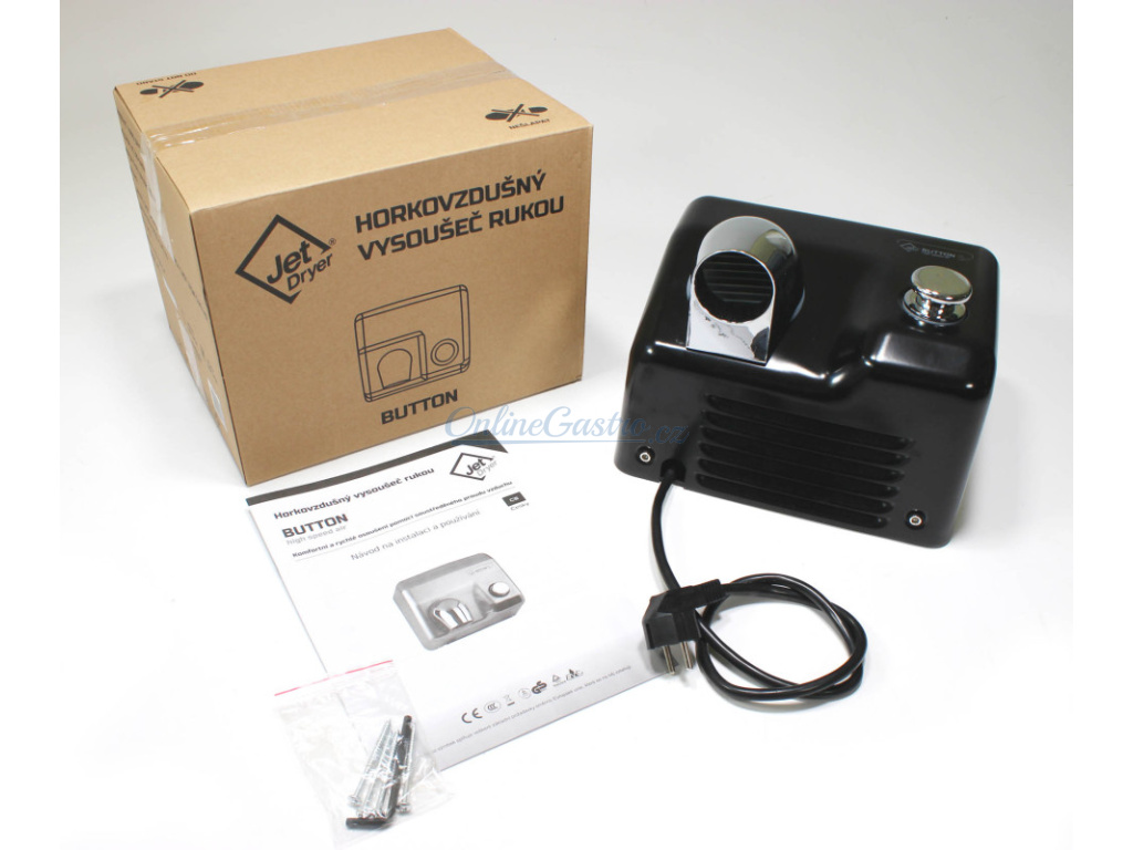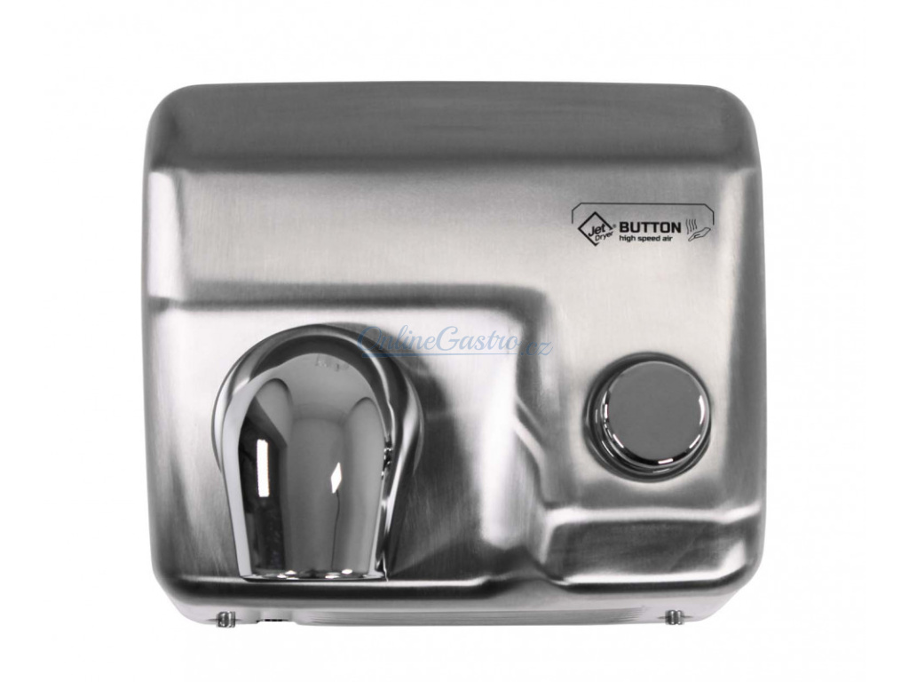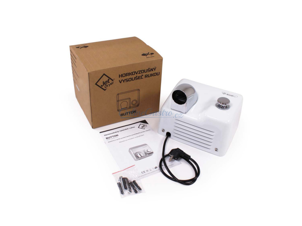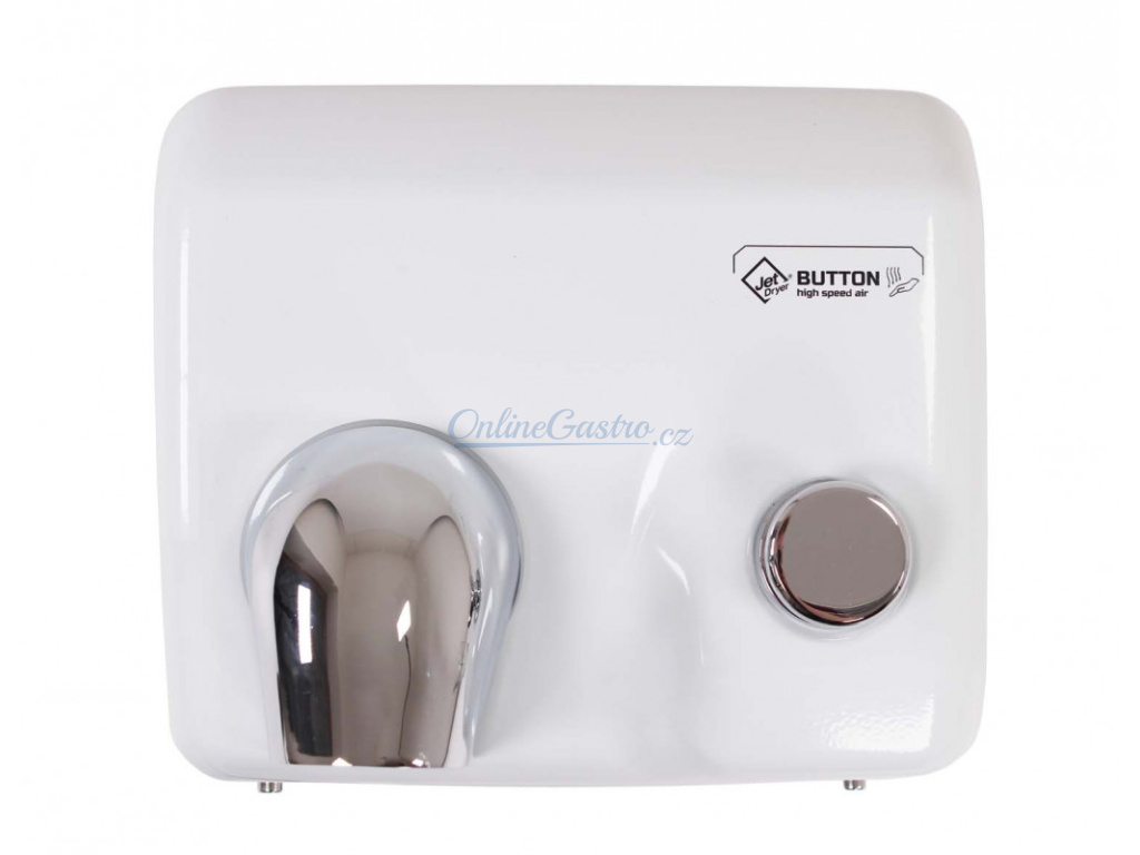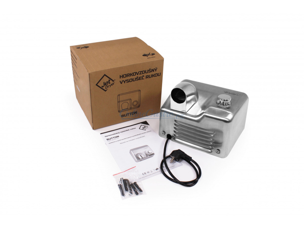 Tělo osoušeče Jet Dryer BUTTON je vyrobeno ze silného a velmi houževnatého kovu. Můžete si vybrat mezi provedením z lakovaného kovu nebo nerezové oceli. Kryt je fixován pomocí bezpečnostních šroubů. Pod osoušeč není možné nic zasunout a strhnout jej ze zdi.