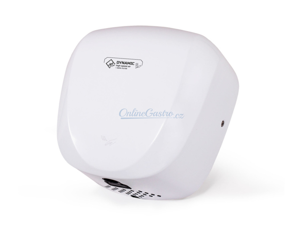 Jet Dryer DYNAMIC je jediný horkovzdušný vysoušeč na trhu vybavený HEPA filtrem. Díky tomu je vzduch vyfukovaný na ruce vždy maximálně hygienický a nezávadný. HEPA filtr zachytí až 99,97% bakterii virů a dalších drobných částic. Osoušeč je naprosto bezkontaktní, aktivuje se automaticky po vložení rukou pod přístroj. Zaoblený design krytu umožňuje snadné čištění.